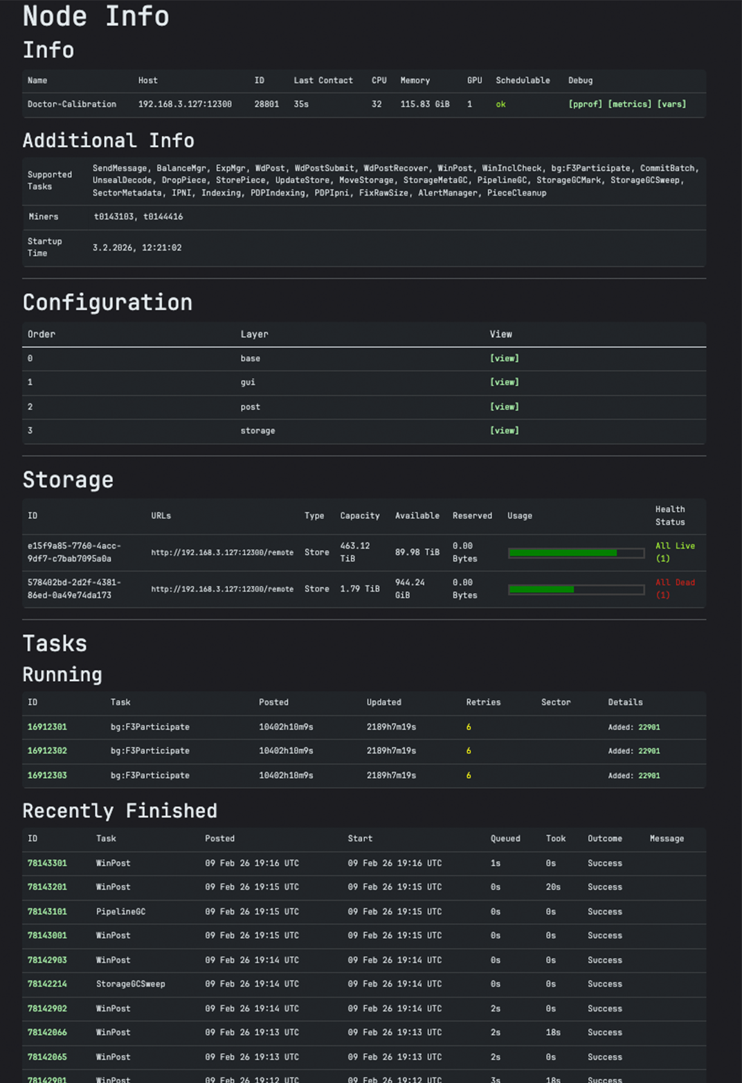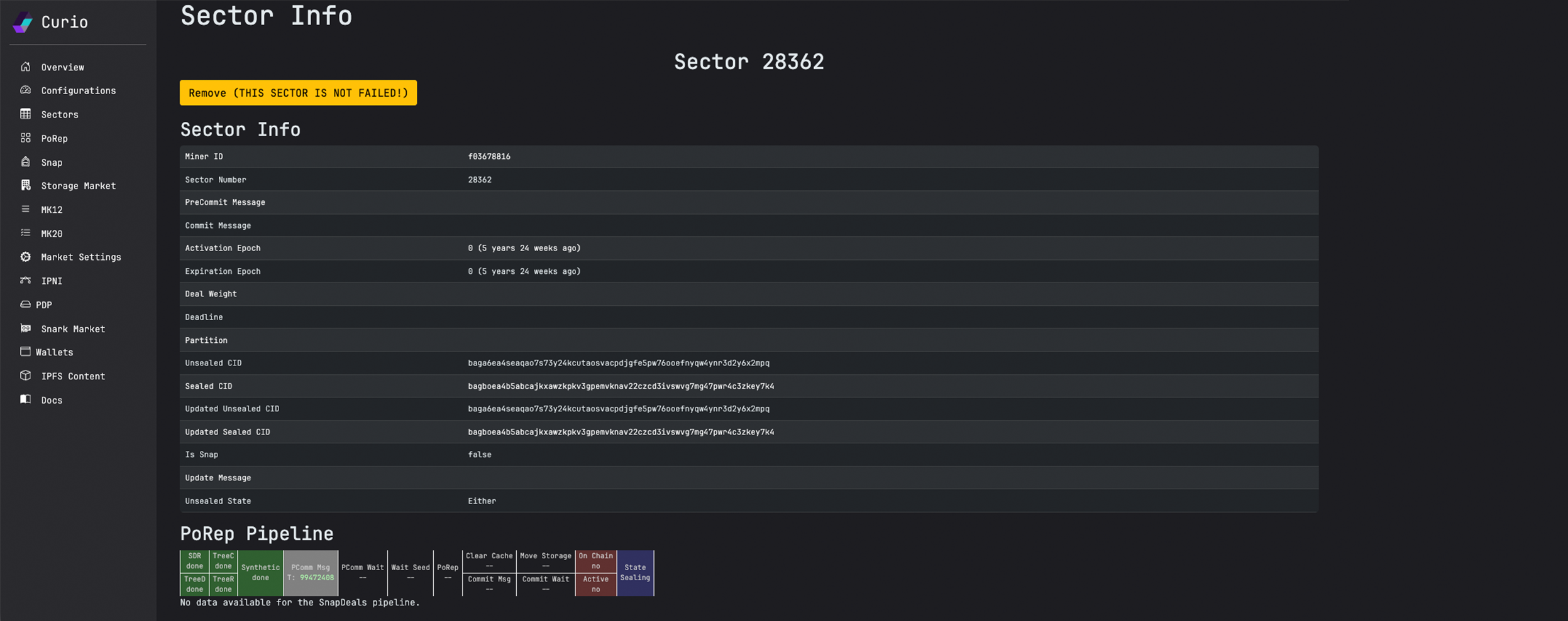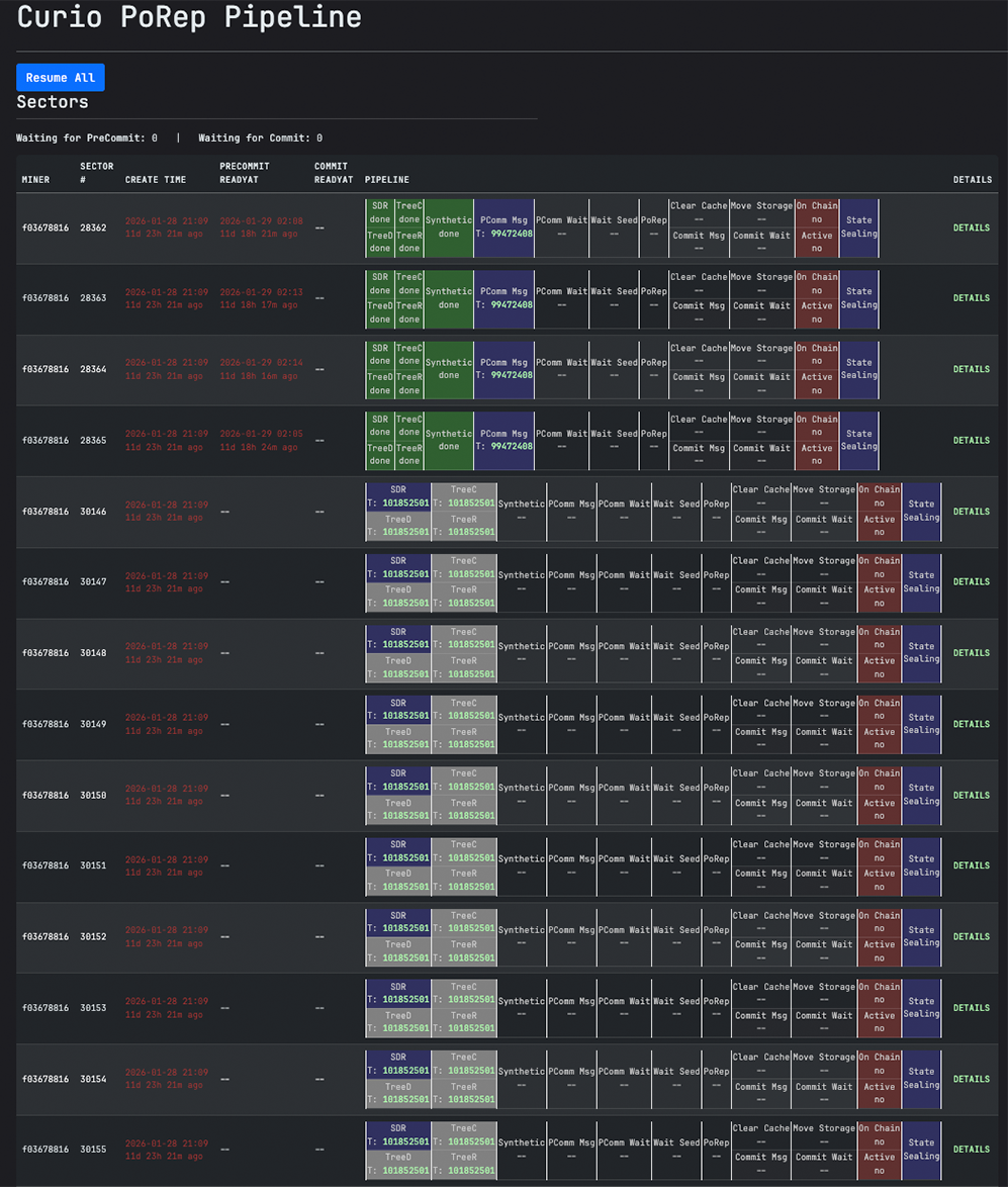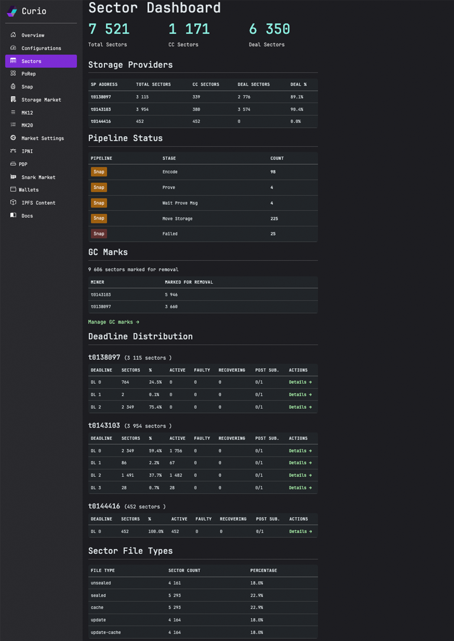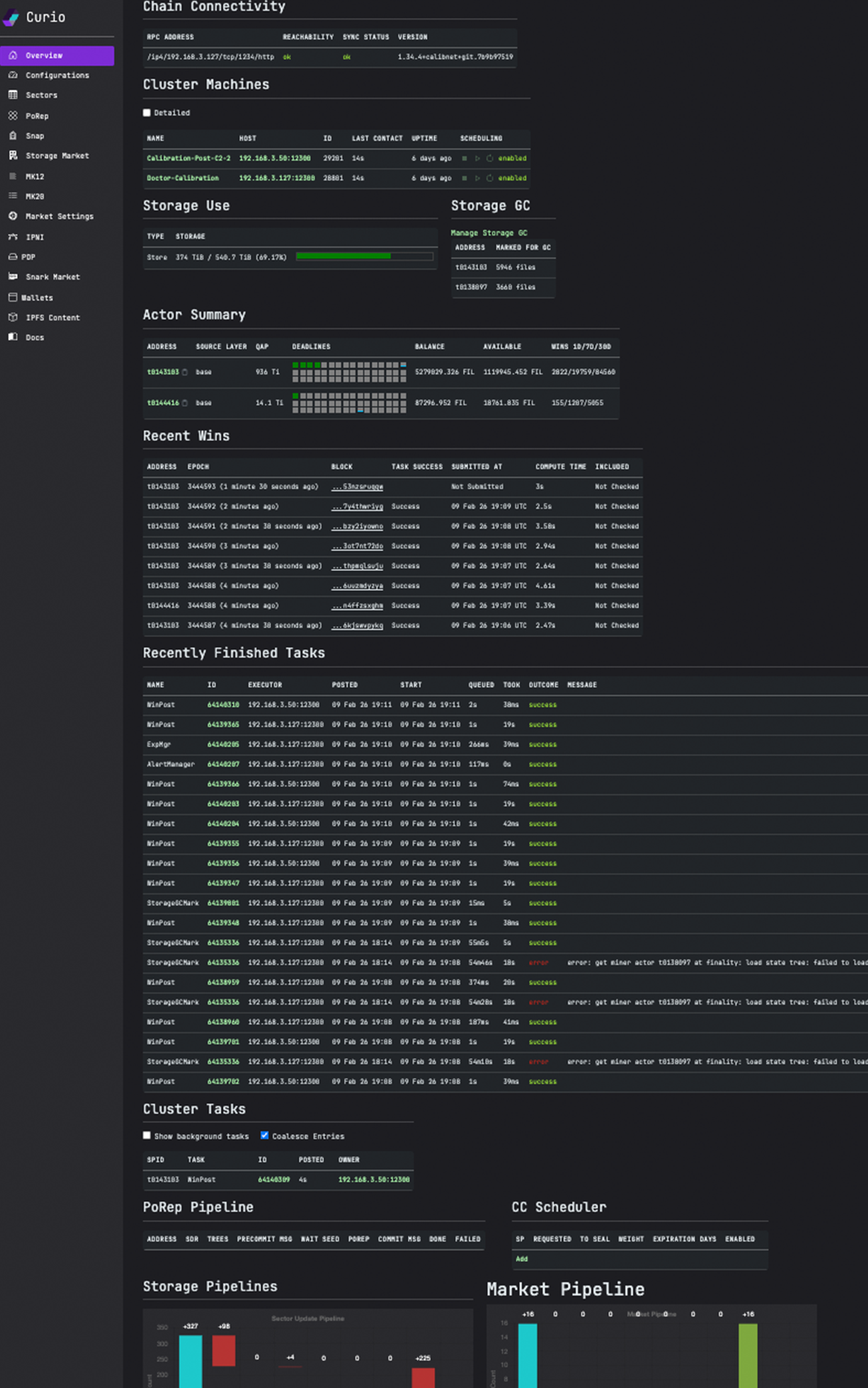 This page can be used to glance as the sectors current being sealed and historically sealed by Curio cluster. It details sector moving through the various sealing stages and status of each stage.